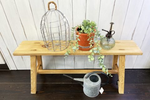 ベンチ型のロングスタンドには、観葉植物やガーデン雑貨を置いて素敵にディスプレイ。