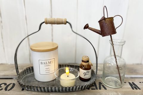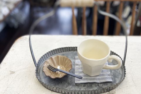 使い古したケーキカップやキッチン小物にお花をアレンジしたりするブロカントガーデンをイメージしたブリキのトレイ。
